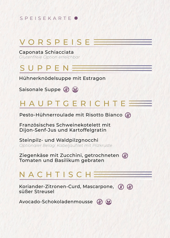 Danach haben Sie die Möglichkeit, Ihre gewünschte Suppe zu wählen, Kartoffelcremesuppe oder auch eine traditionelle Gulaschsuppe. Das Hauptgericht bietet eine Vielzahl von Optionen, Ente, Fish, Rind sowie auch vegetarische Alternativen. Als Dessert bieten wir Ihnen einen leichten Obstsalat als Abschluss oder eine leckere Flantorte. Wir nehmen natürlich auch Acht auf unsere Gäste mit einer Lebensmittelunverträglichkeit. Und wie sieht es mit den Getränken aus? Zu einem perfekten Abend gehören selbstverständlich auch ein qualitatives Getränkeangebot. Sie haben 2 Möglichkeiten: Die Getränke können vom Menü bestellt werden, oder Sie haben die Möglichkeit, ein Getränkepaket zu reservieren. Bei diesem können Sie eine unbegrenzte Anzahl der aufgelisteten Getränke konsumieren.